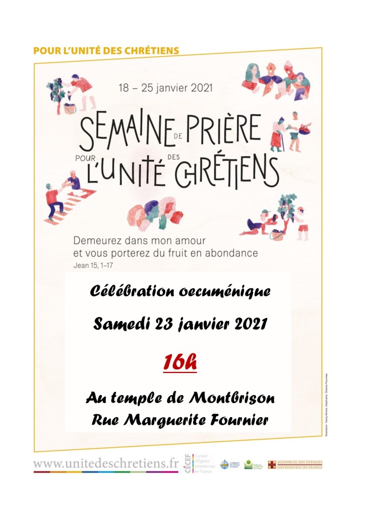 Semaine de prière pour l’unité des chrétiens du 18 au 25 janvier CHANTAL PROTIERE archives 15 janvier 20218 février 2021 Pour prier chaque jour de cette semaine , la communauté de Grandchamp, en Suisse, nous propose le document ci-joint. Semaine de la prière pour l’unité des chrétiens, une prière pour chaque jour Découverte de la communauté de Granchamp Publié par CHANTAL PROTIERE Voir tous les articles par CHANTAL PROTIERE Publié 15 janvier 20218 février 2021
