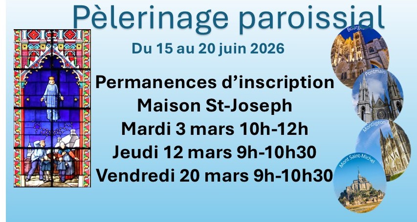 Nous vous l’avions annoncé dans les Échos de janvier : la paroisse organise un pèlerinage, du 15 au 20 juin, avec transport en car et hébergement au Sanctuaire de Pontmain (Mayenne), lieu d’apparition de la Vierge Marie à des enfants en 1871.