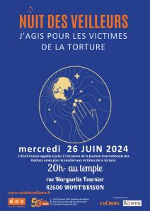 Pour la 19e Nuit des Veilleurs – nuit se situant autour du 26 juin 2024 – l’Action des Chrétiens pour l’Abolition de la Torture (ACAT) propose le thème suivant : « Grâce au Christ, la vie a vaincu la mort » en s’appuyant sur le message de l’apôtre Paul « ô mort, où est ta victoire ? » (I Corinthiens 15, v. 55). La prière est pour l’ACAT à la fois prolongement et fondement. Elle est un moment très particulier de l’action. Elle lui donne une autre dimension, et permet d’agir différemment pour les torturés ou les condamnés. Organisé par l’ACAT-France à la Journée internationale des Nations unies pour le soutien aux victimes de torture (26 juin), cet évènement œcuménique se déroulera en France, et à l’international.