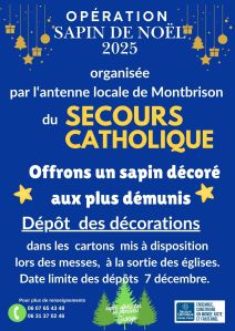 À Montbrison, nous sommes une équipe de 8 personnes, dont la mission essentielle est l’accueil fraternel, l’écoute bienveillante et l’accompagnement. Nous sommes actuellement en recherche d’un local à partager avec d’autres associations pour vivre nos permanences. Nous réalisons également des actions ponctuelles : offrir un sapin et des décorations à ceux qui n’ont pas les moyens de célébrer Noël (cf. ci-contre), proposer une soupe lors de la soirée du 8 décembre… Pour cela, nous devons communiquer et informer : des rencontres avec des assistantes sociales et une responsable de la Croix-Rouge sont prévues. Nous sommes également en contact avec des structures d’hébergement d’urgence.